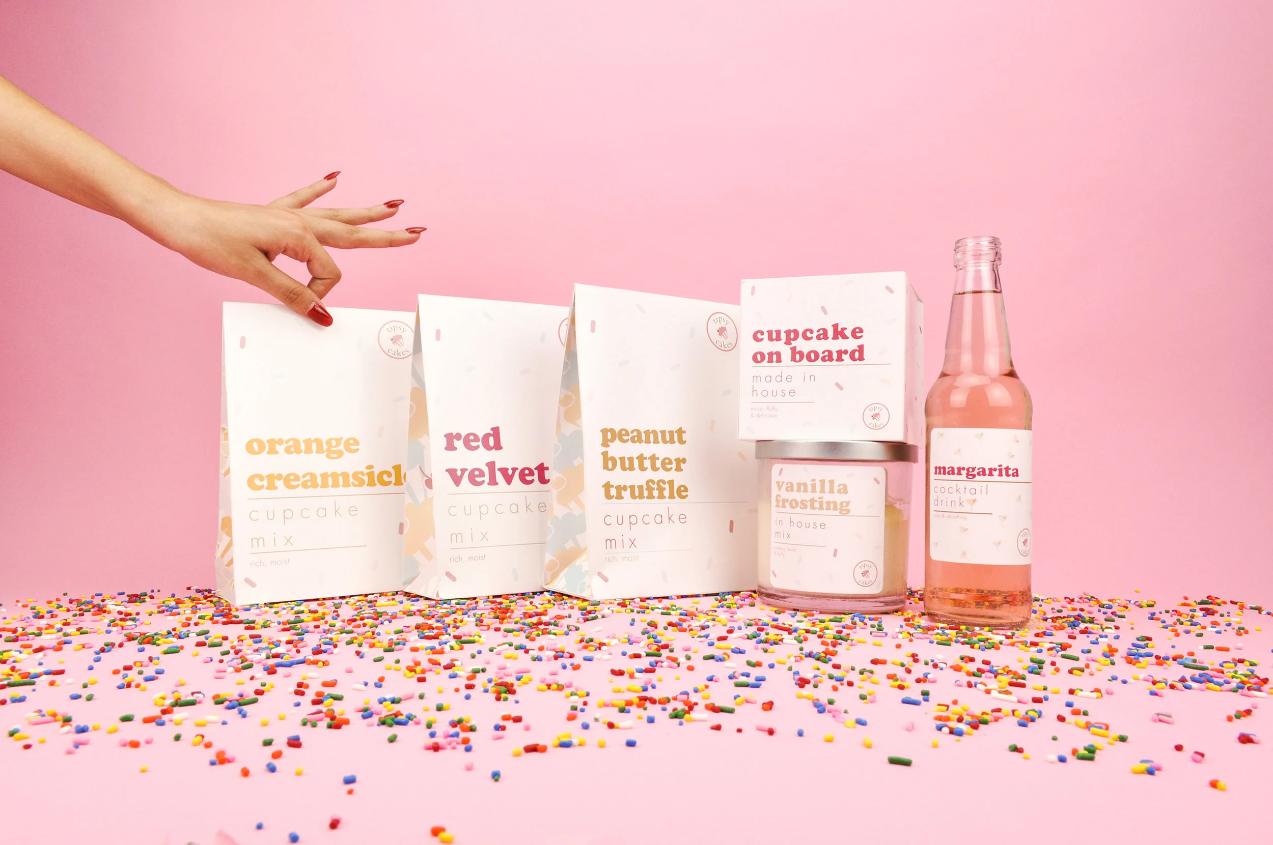 Objective: Create a ficticious restaurant and create the logo, branding design, and packaging for it. Tipsy Cakes Cupcake Shop is a restaurant in which the house chef professionally pairs cocktails and cupcakes based on flavors. Aside from the to-go cupcake box and drinks, packaging includes a variety of take home cupcake mixes as well.