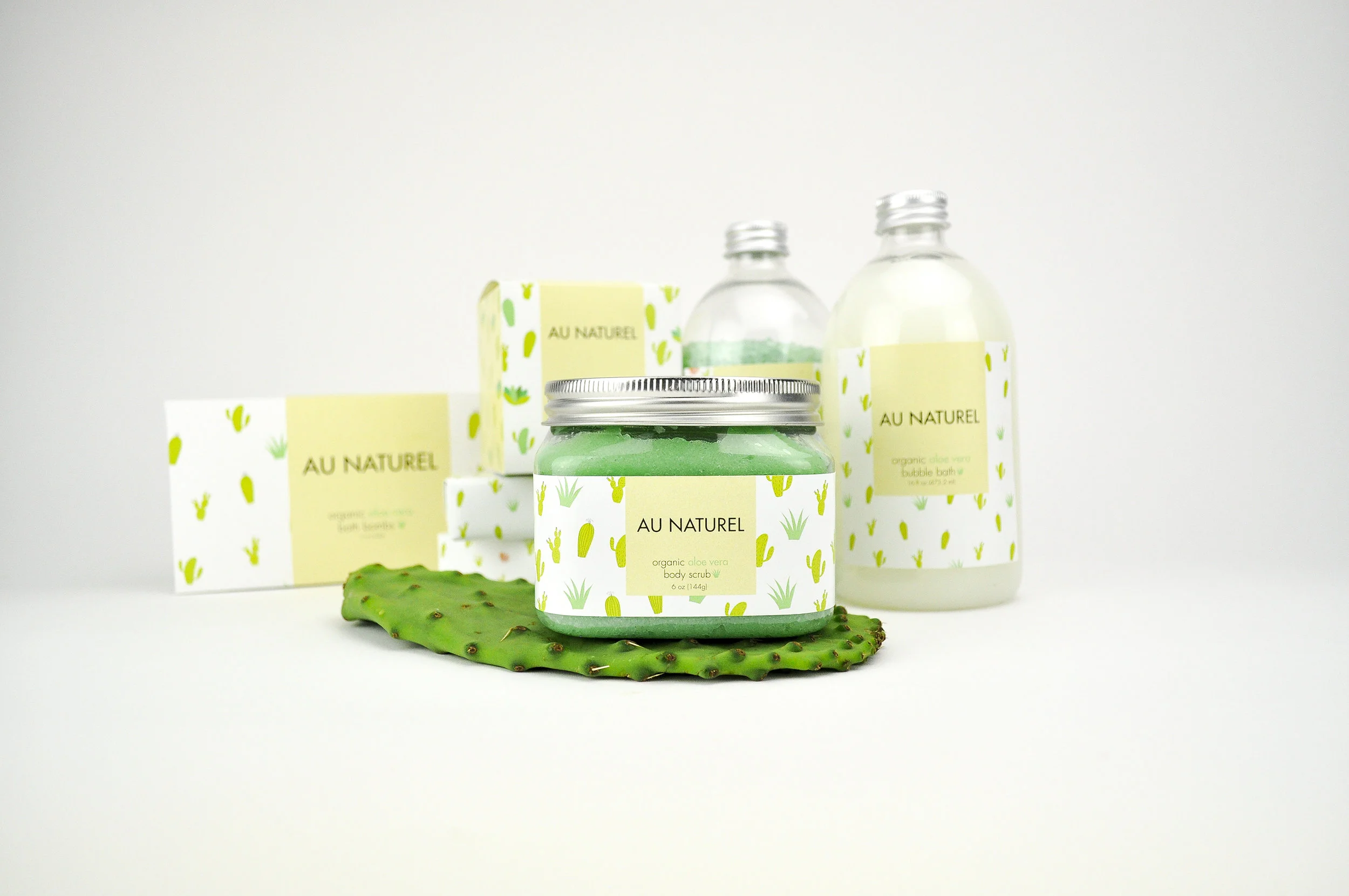 Objective: Create the logotype, branding identity, and packaging for a bath and body product line. Au Naturel is a line of bath and body care products that contain only natural ingredients. Products include bath salts, bath bombs, soaps, body scrubs, candles, and bubble baths.
